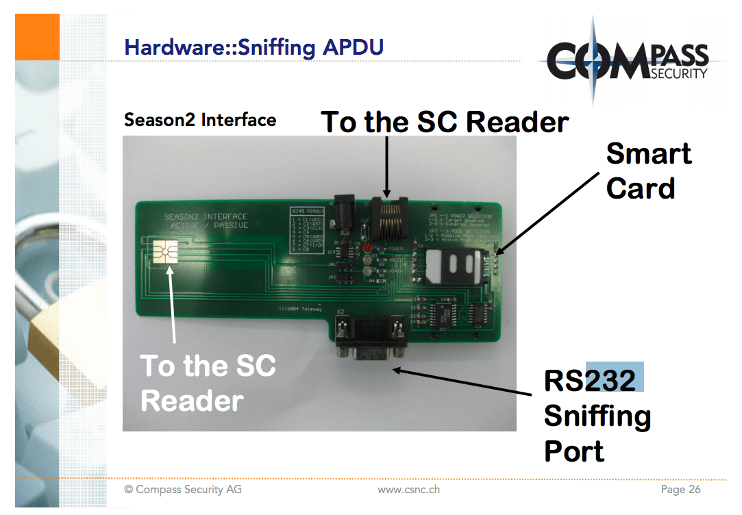 The chip uses application protocol data unit (APDU) to send data. Ivan Buetler, a researcher at Swiss computer security company Compass Security, gave a brilliant talk at the Black Hat conference in 2008 about this protocol that helped me understand how it works from a communication perspective (What happens when I tap my card? What low-level commands are sent and received?). He explained some of the possible ways to attack the protocol, such as sniffing the APDU communications channel using an RS232 (serial communication) hardware device. The example he gave was the Season 2 RS232 sniffer, commonly used in satellite TV hacking back in the day.